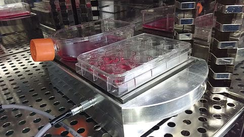 The cells used in work are stem cells. Stem cells can be stimulated to change into different cell types such as bone, cartilage, ligament, tendon and muscle. In the lab, this stimulation is typically done by using complex and expensive engineering or cocktails of chemicals. Using nanovibrations to direct stem cell behaviour to generate bone cells doesn’t require dangerous or expensive tools. Nanovibrations are naturally experienced by our organs as we breathe, walk and move. Stem cells respond to these unique vibrations to regenerate damaged tissue. These vibrations have specific frequencies unique for different tissues and are measured in hertz (Hz) e.g. for bone around 970Hz.