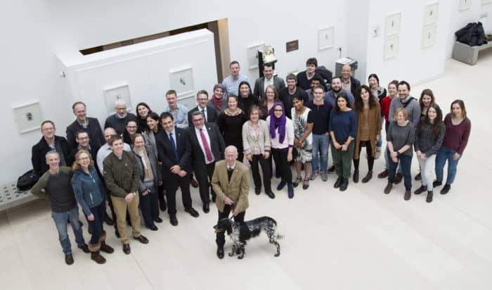 Glasgow CeMi researchers and Sir Bobby Charlton, Find A Better Way, with veterinary patient Eva.